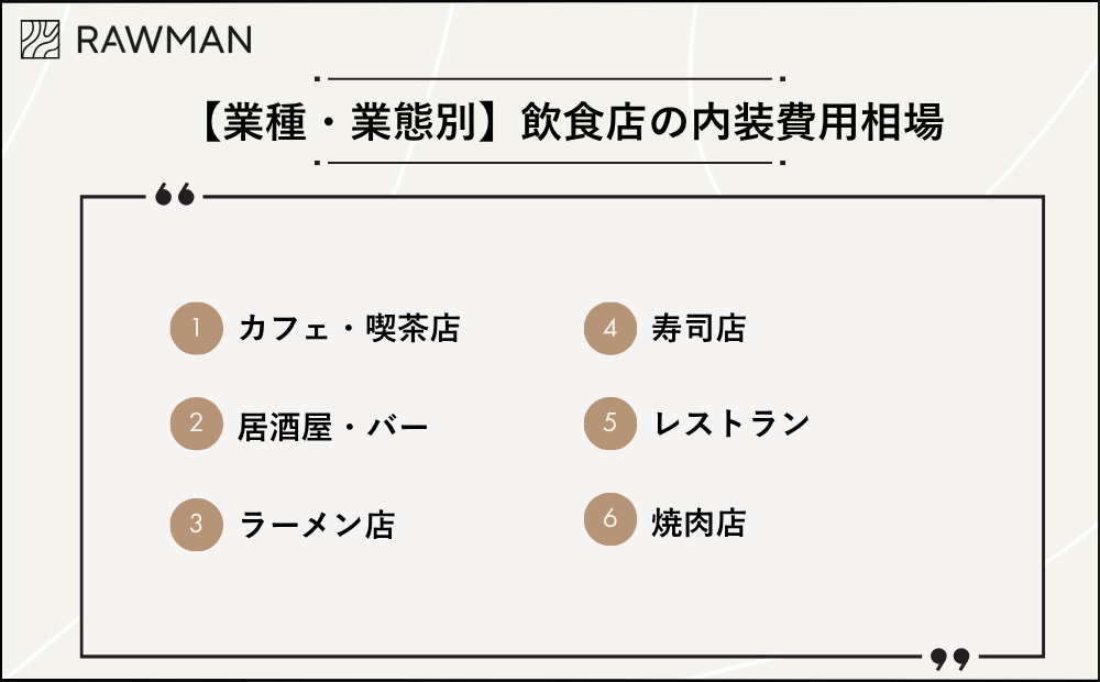 業種や業態によって必要な設備が異なるため、内装費用にも大きな差が生まれます。ここでは主要な業態別に費用相場を解説します。