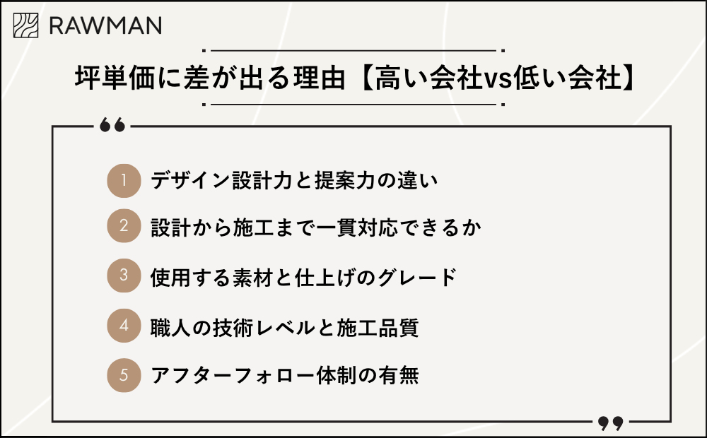 - 坪単価の差:デザイン力、施工品質、素材グレード、アフターフォローなどで変わる