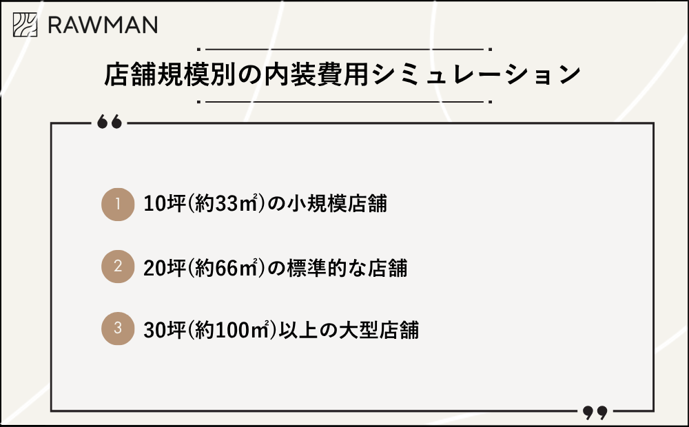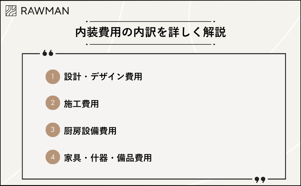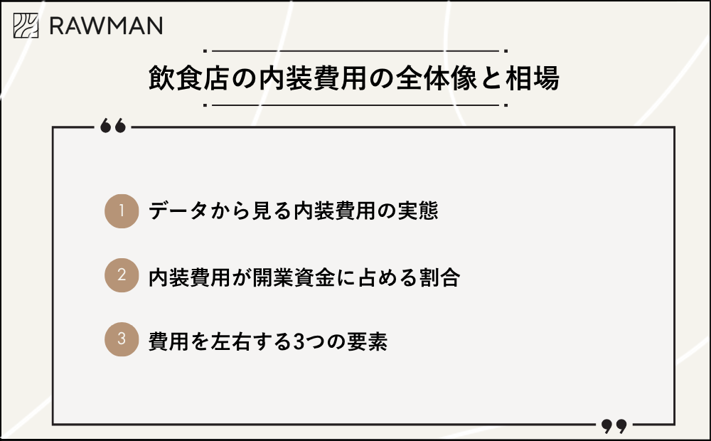 飲食店の内装費用は、以下の3つの要素によって大きく変動します。