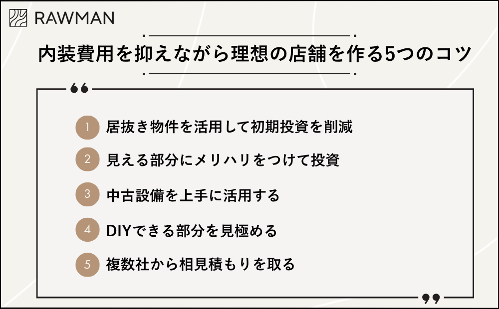 - コスト削減:居抜き物件、中古設備、メリハリのある投資、相見積もりが有効