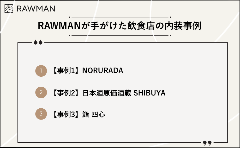 株式会社RAWMANでは、多数の飲食店の内装デザイン実績があります。コンセプト作りから設計・施工まで一貫してサポートいたしますので、飲食店の開業をお考えの方は、ぜひお気軽にご相談ください。