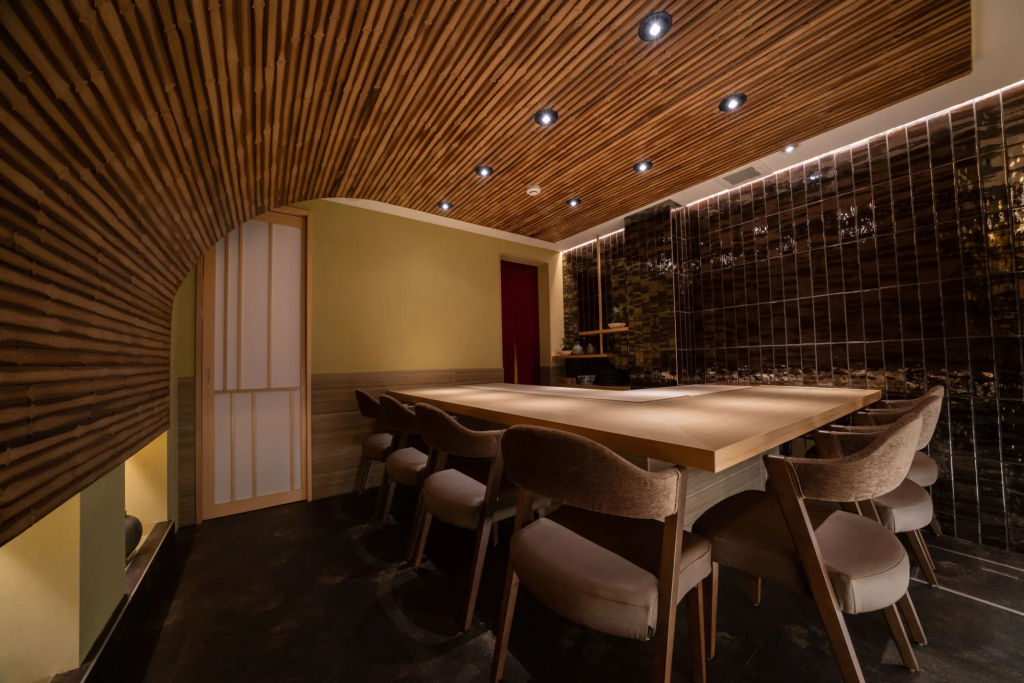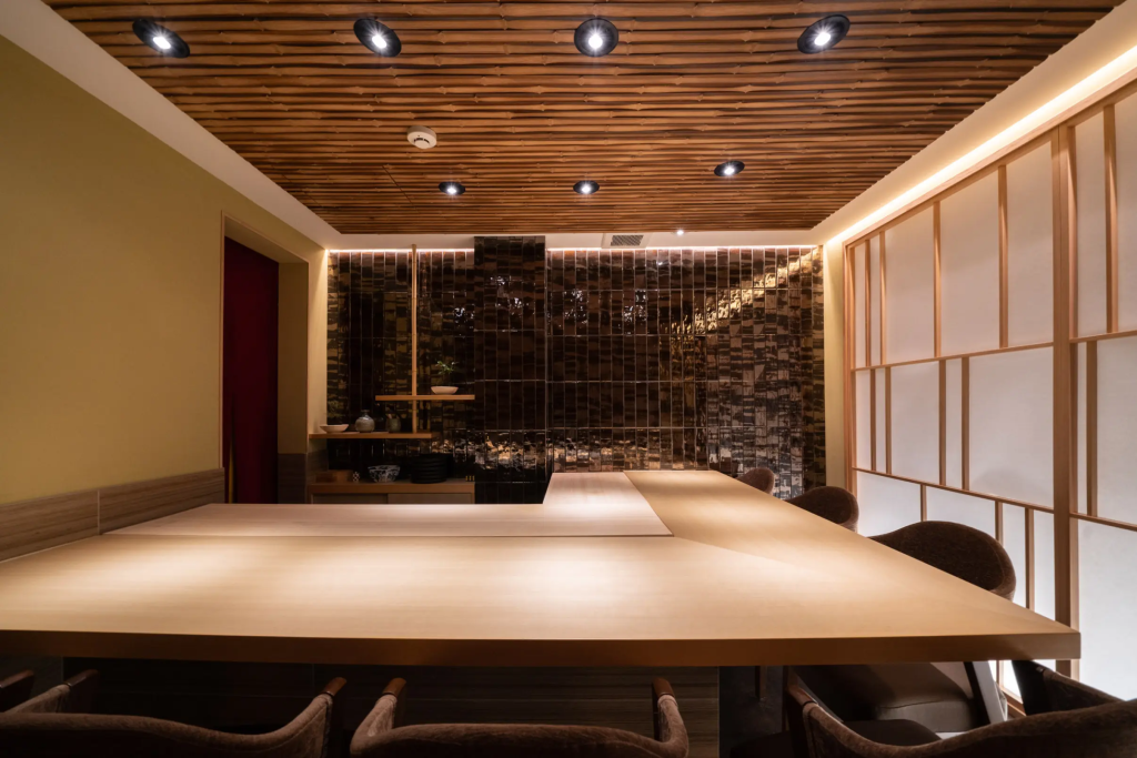 壁面には白を基調としたタイルを使用し、真鍮色をアクセントとして配することで、伝統的な寿司店とは一線を画す現代的な空間を実現しています。華やかでありながら料理を引き立てる配色は、新しいスタイルの寿司体験を求める顧客層に支持されています。