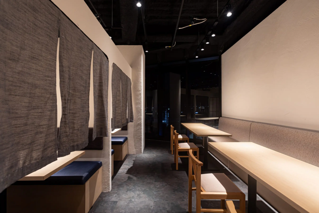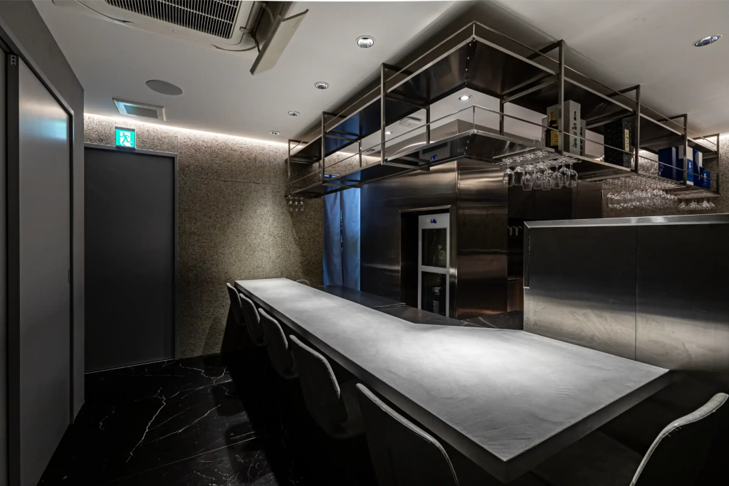 VIP客席は、メイン客席とは別の入口を設けてプライベート性を確保しています。いちょうのL型カウンターを採用し、座席の間隔を広めに取ることで、ゆったりとした時間を過ごせます。黒を基調とした墨モルタル左官と、間接照明で演出した木格子が、品のある特別な空間を作り上げています。