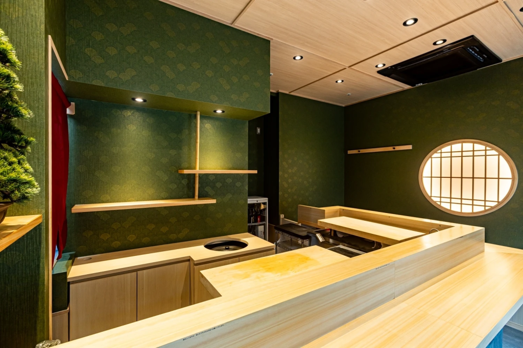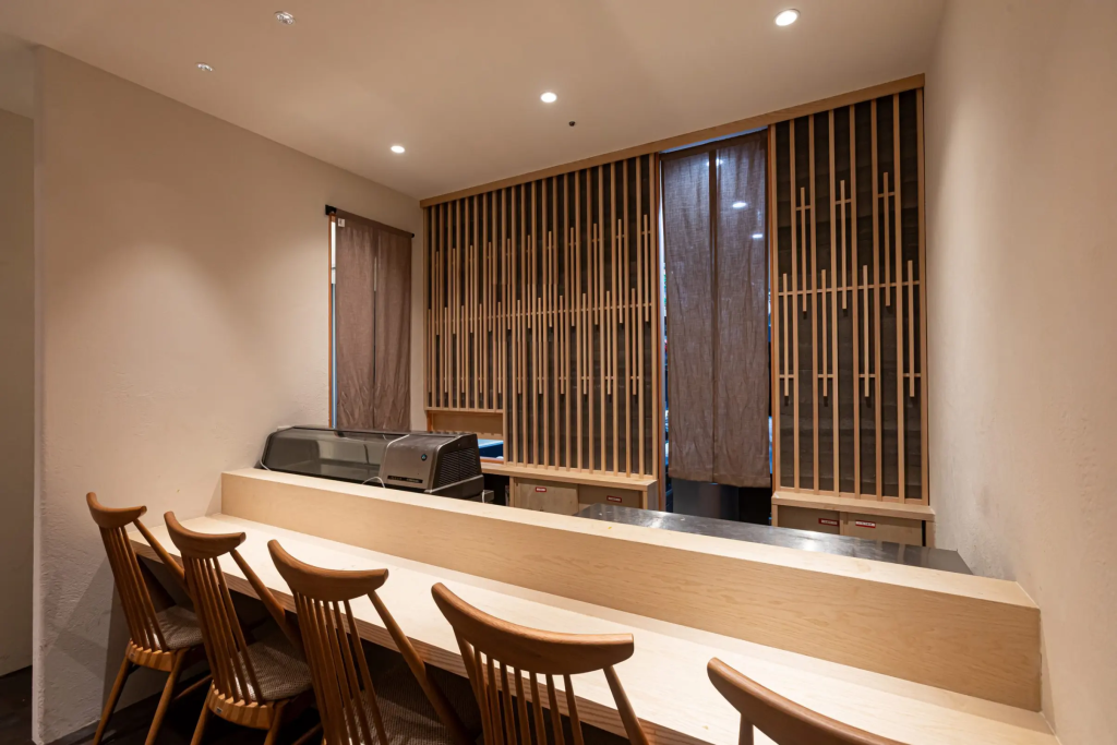 カウンター設計においても、動線と居心地のバランスを重視しました。限られた面積の中で、職人の作業効率とお客様のゆとりある空間を両立させています。モダンなデザインの中にも、寿司屋としての機能性をしっかりと確保した設計です。