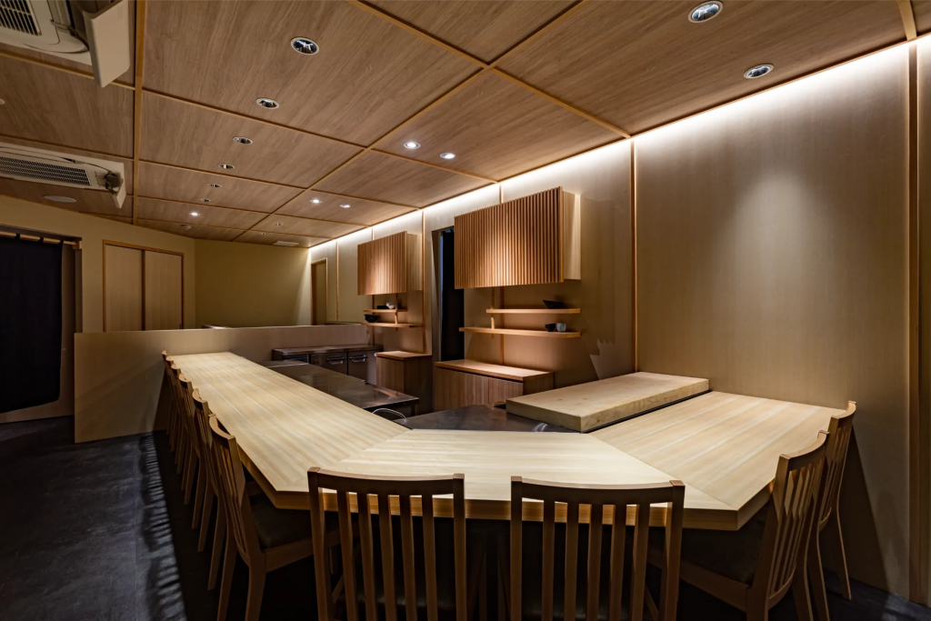 小規模店舗だからこそ実現できる、研ぎ澄まされた集中力を促す空間設計は、面積が限られていても高級寿司屋としての価値を十分に表現できることを示しています。カウンター寸法の最適化が、いかに空間体験を左右するかがわかる好例です。