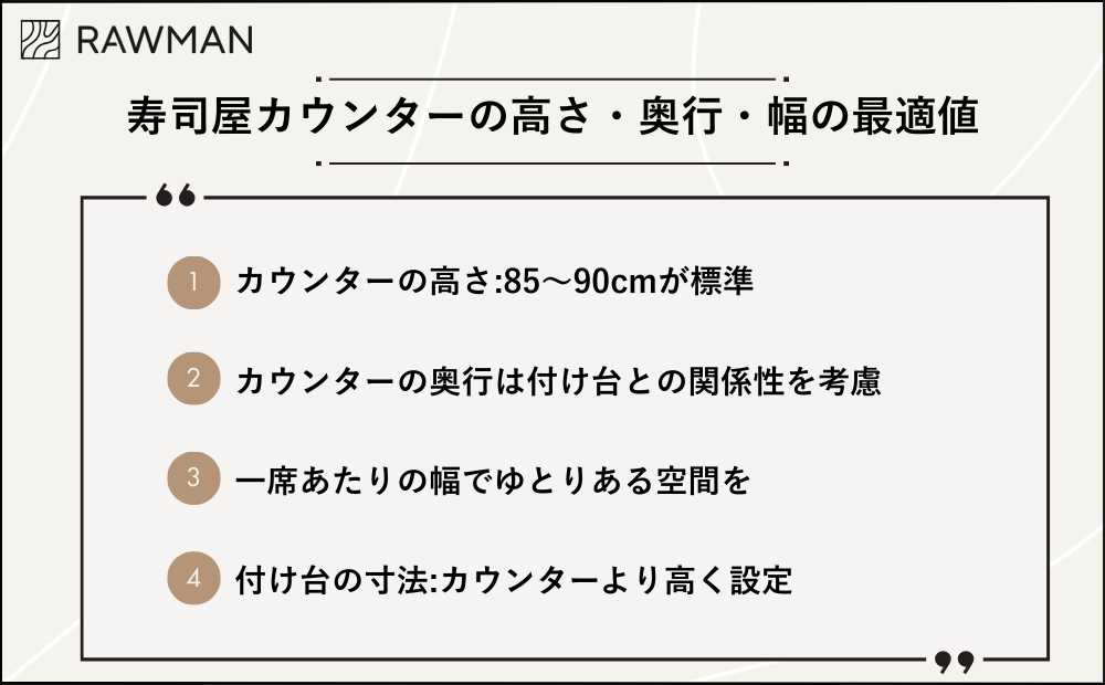 寿司屋のカウンター寸法は、お客様の満足度と職人の作業効率を左右する重要な要素です。カウンターの高さや奥行、座席幅が数センチ違うだけで、居心地の良さは大きく変わります。