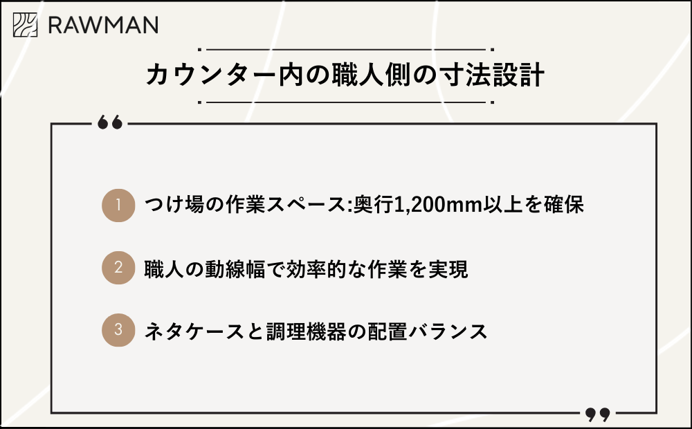 カウンター寸法は、お客様だけでなく職人の働きやすさにも直結します。つけ場の奥行が狭いと、ネタケースや調理機器の配置に無理が生じ、作業効率が落ちてしまいます。