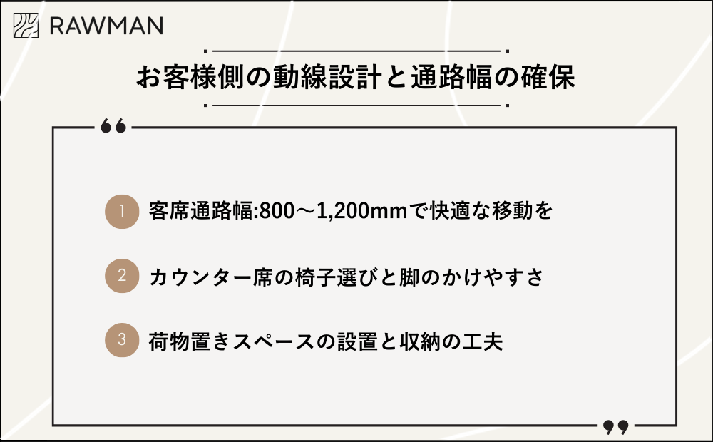 お客様側の動線設計と通路幅の確保