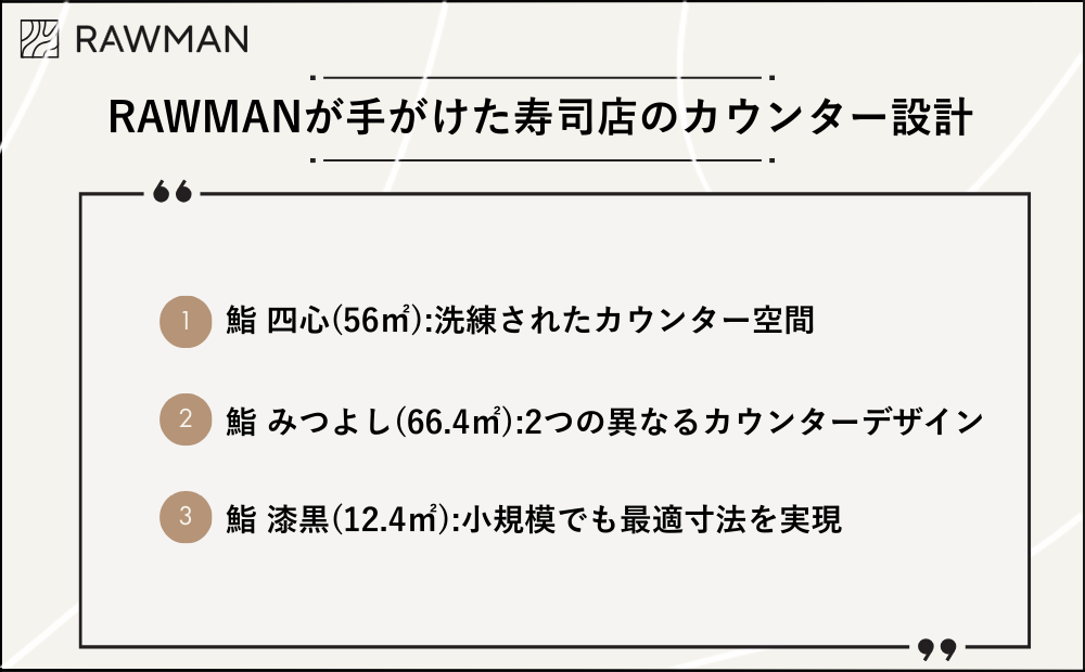 RAWMANが手がけた鮨 四心、鮨 みつよし、鮨 漆黒の事例からもわかるように、限られた面積の中でも最適な寸法設計と空間演出によって、お客様に特別な体験を提供できます。